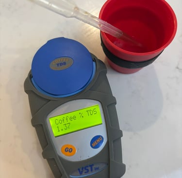 The picture above is a refractometer. It measures the concentration of dissolved solids (Total Dissolved Solids or TDS) in brewed coffee by analysing how light bends through the liquid, helping determine extraction strength and brewing quality.