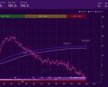 Overall, it was a success! The roast curve is a steady decline without any major tempriture spikes or drops mid roast. First crack arrived over a minute sooner and we held the development time from 20% to 23%.