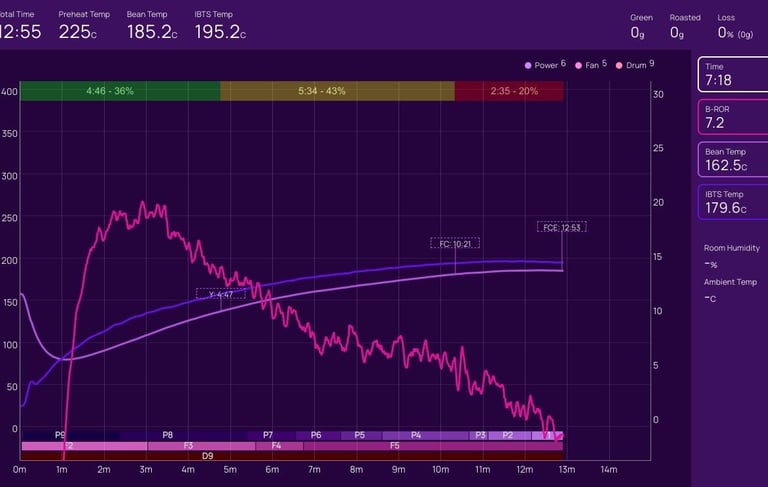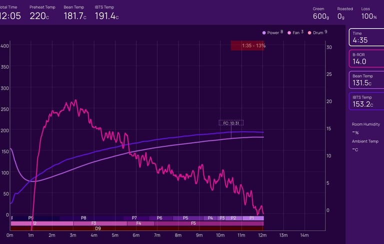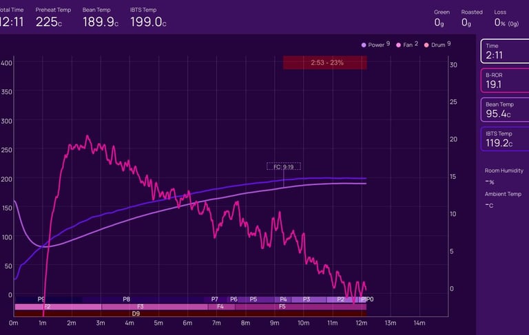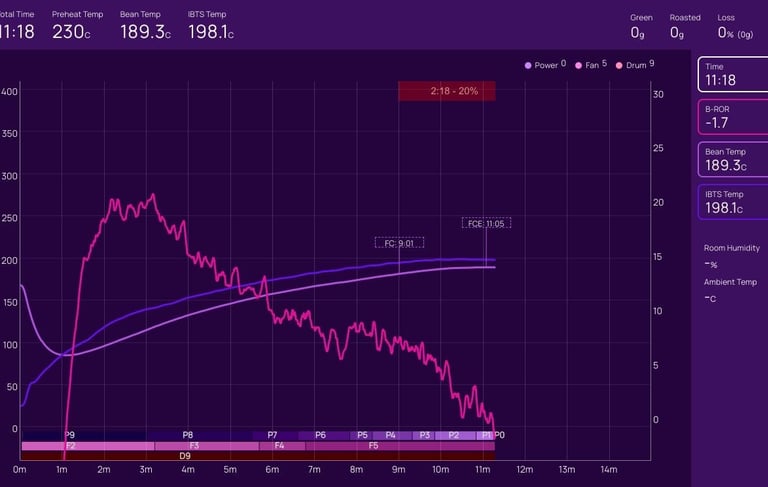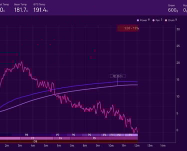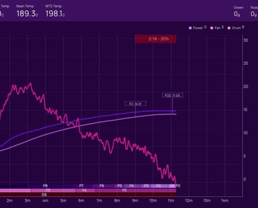 On the next roast, we will hold P8 for an extra minute or so before dropping to P7, and hold the Fan at F4 for an extra 30s to one minute before raising to F5; this should help retain enough heat for an earlier and shorter first crack - then we can extend the development time from 20% to 23-25%.